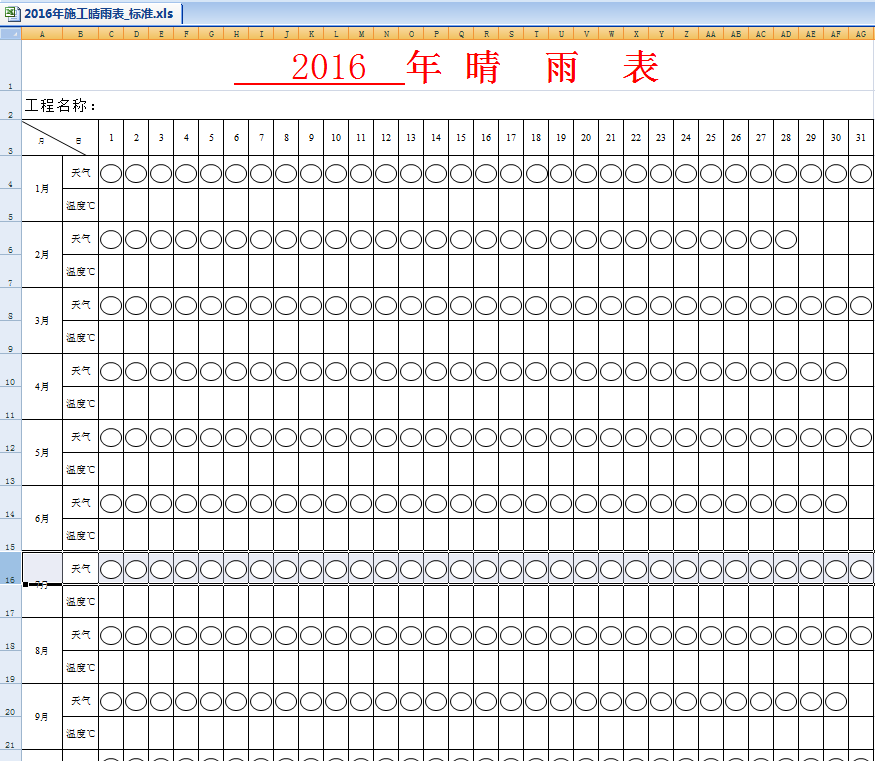 2016年施工晴雨表分享給需要的朋友,建筑施工對于天氣的了解是很重要的,可以讓你對施工進(jìn)行合理的安排,施工晴雨表來記錄是很有必要的,小編這里分享一個(gè)空白標(biāo)準(zhǔn)的2016年施工晴雨表,趕緊下載吧。