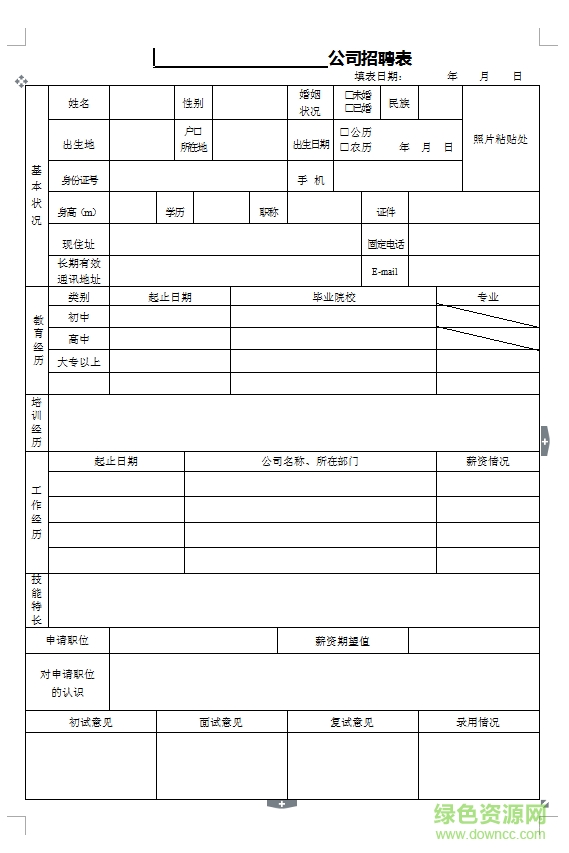 公司招聘表格模板是一份doc格式的求職招聘表格,很多公司在招人時(shí)都會(huì)用的到,如果你是作為公司的人事,就要制作招聘表格了,相信這個(gè)模板可以幫得到你的。歡迎有需要的朋友到綠色資源網(wǎng)下載后使用!