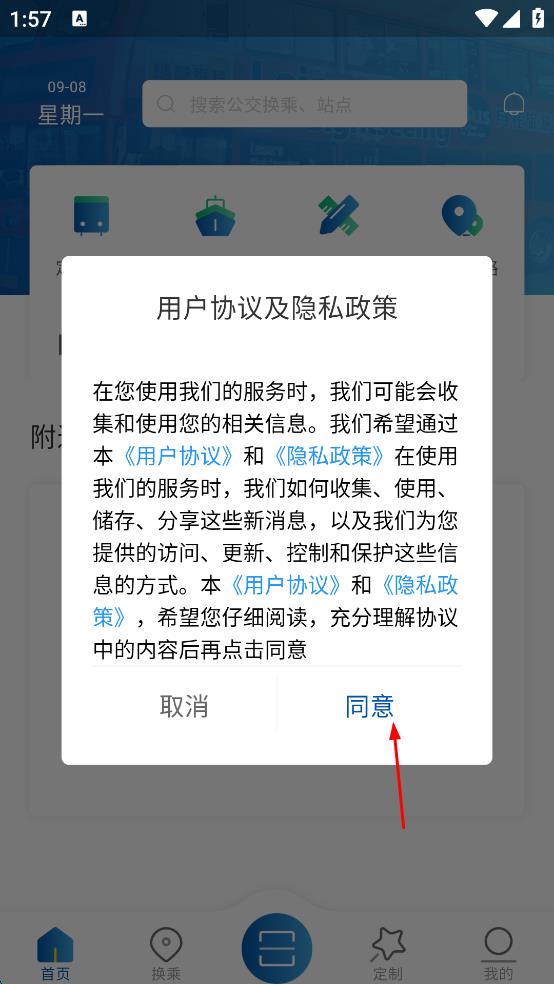 1、打開舟山公交APP,彈出用戶協(xié)議及隱私政策提示,仔細閱讀相關內容后,點擊“同意”按鈕,進入APP主界面。