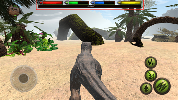 1、進(jìn)入到游戲的場景內(nèi)之后,玩家將需要看一看恐龍的身體狀況,上方的四個(gè)數(shù)據(jù)條是恐龍的身體狀況外在顯示;