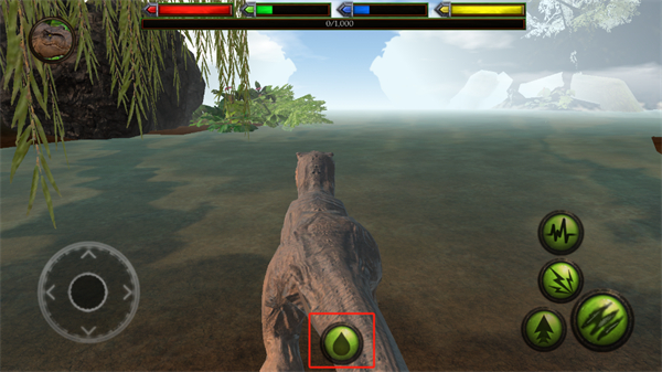4、當(dāng)玩家靠近水源時(shí),下方將會出現(xiàn)一個(gè)綠色的小按鈕,點(diǎn)擊即可進(jìn)行飲水,喝飽了水之后,恐龍的身體狀況也會變好一點(diǎn)。