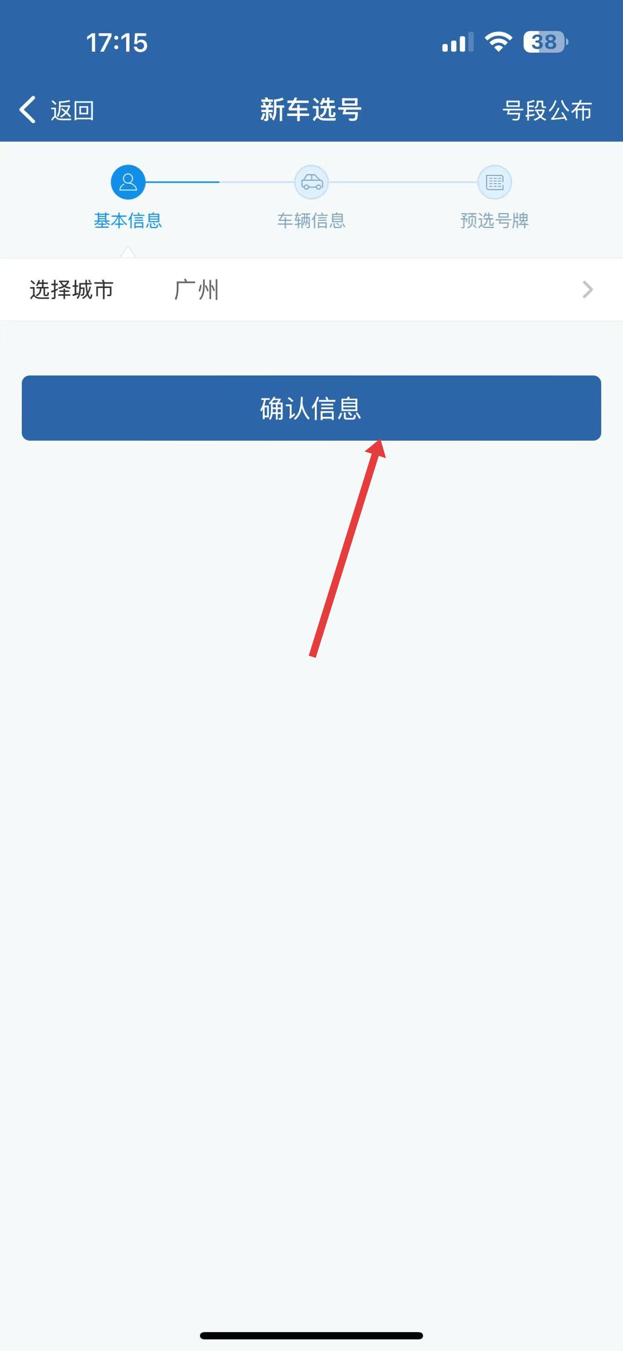 2、進(jìn)入新車選號頁面,選擇城市后點擊確認(rèn)信息。