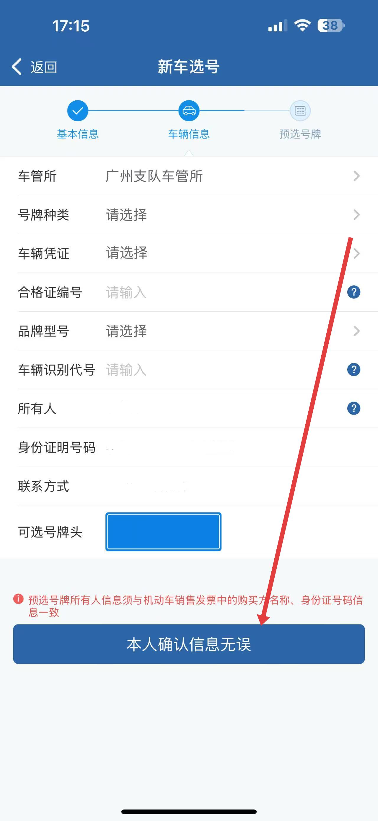 3、填寫車輛相關(guān)信息,確認(rèn)無誤后點擊本人確認(rèn)信息無誤,進(jìn)行預(yù)選號牌。