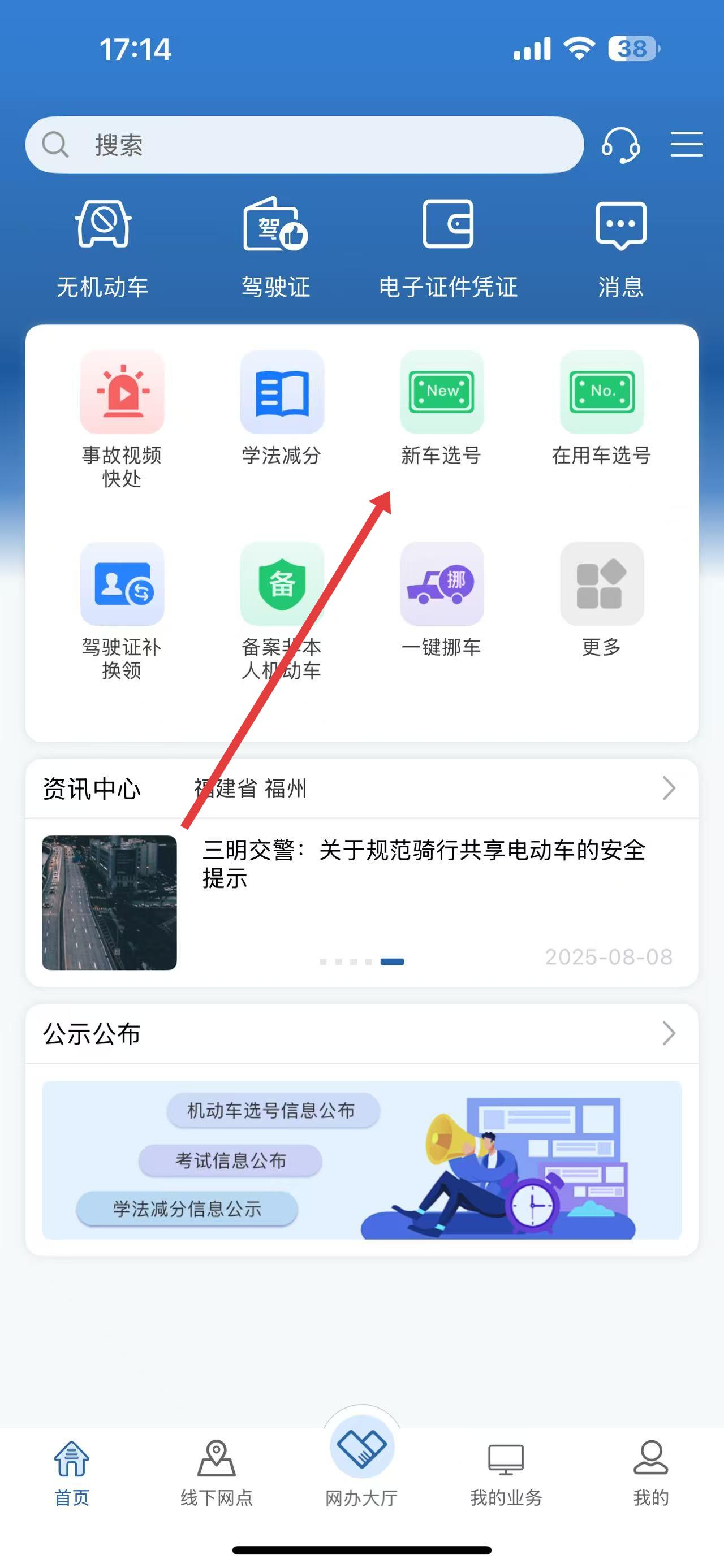 1、打開交管12123APP,在首頁點擊新車選號按鈕。