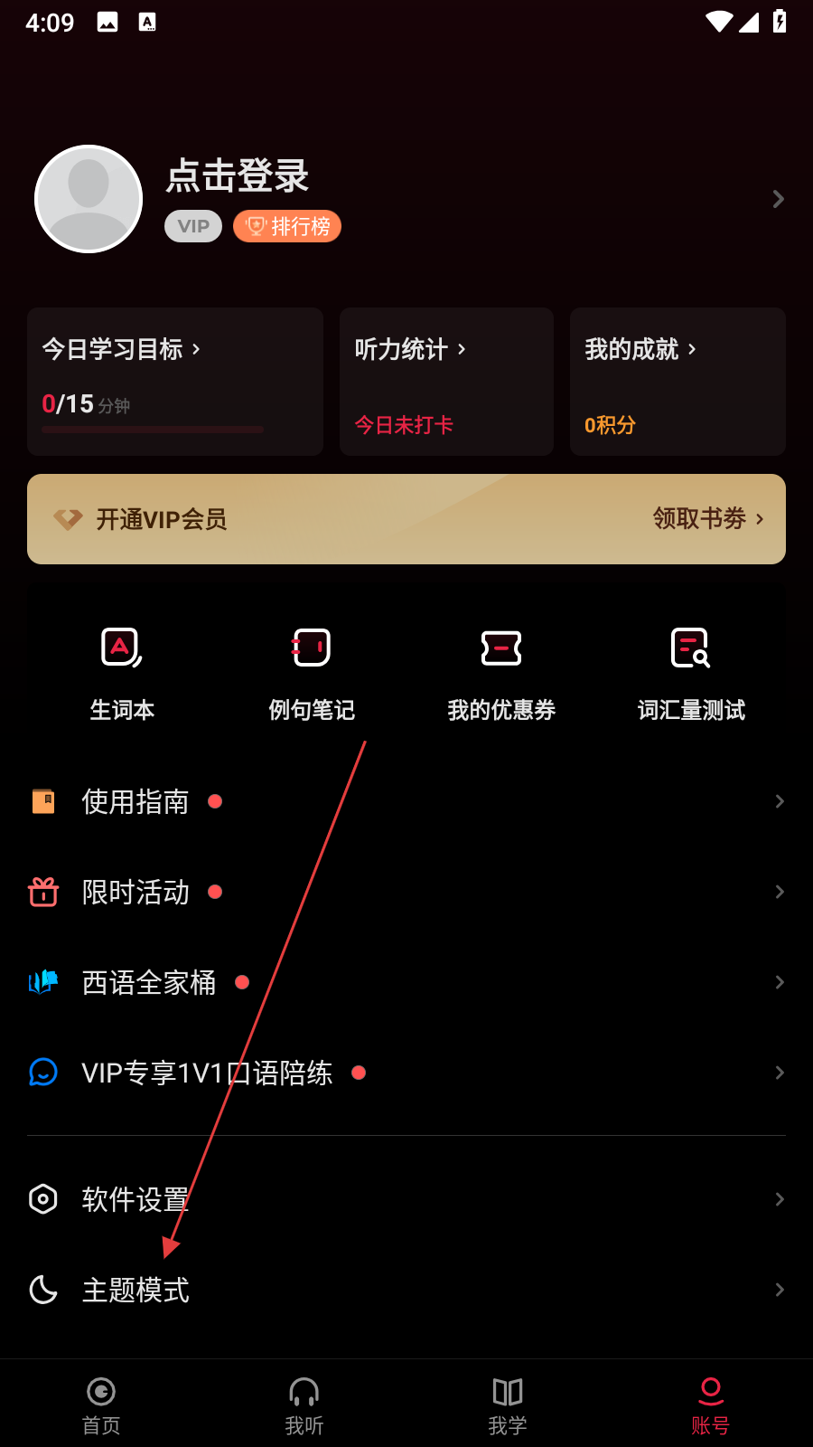 2、在賬號頁面中,找到主題模式選項并點擊,進入主題設置界面。