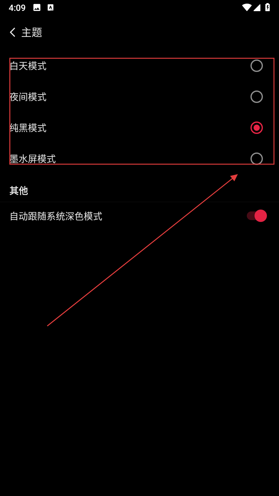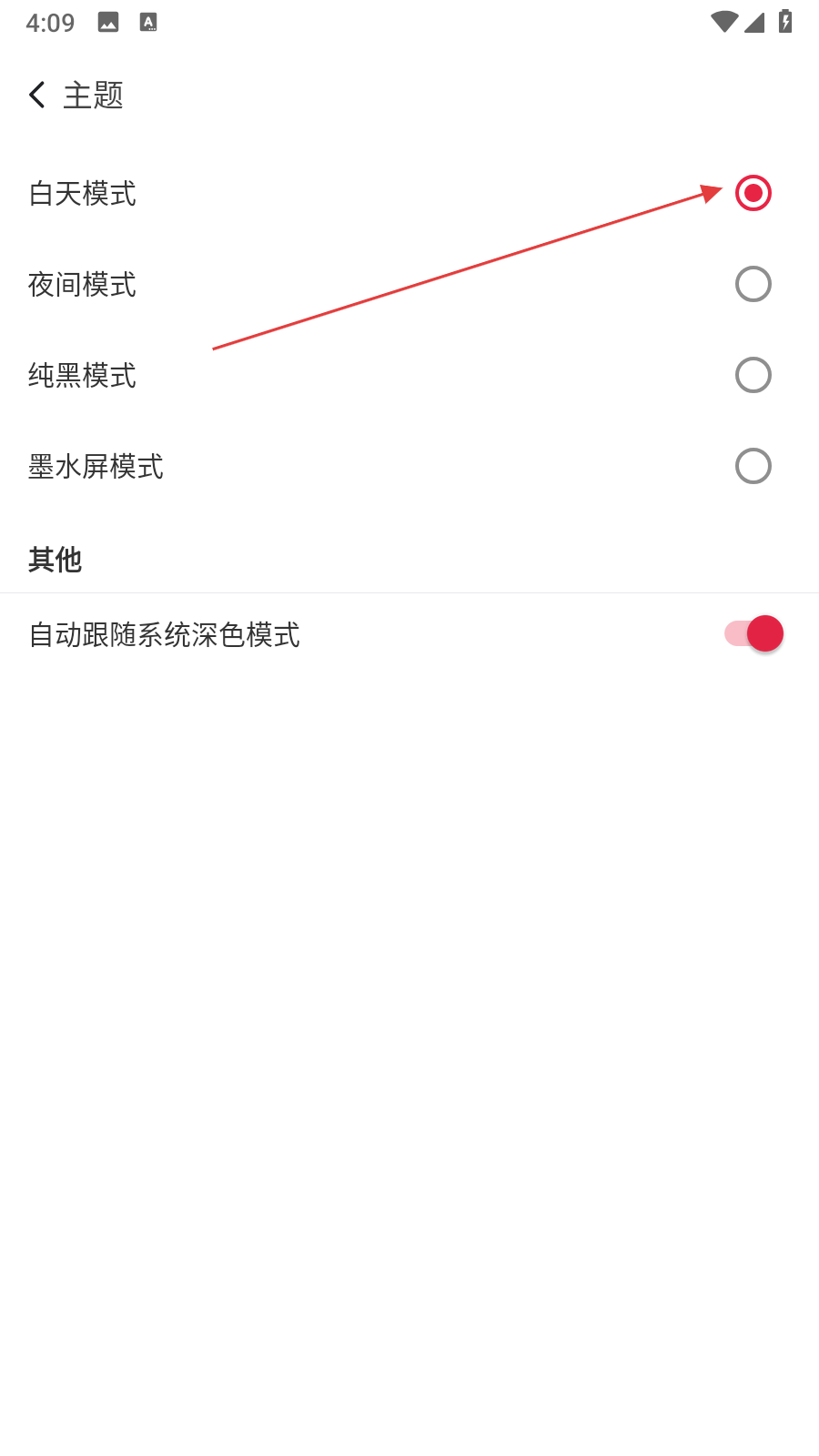 4、若選擇白天模式,點擊白天模式右側的圓形選擇按鈕,即可切換為白天主題模式。