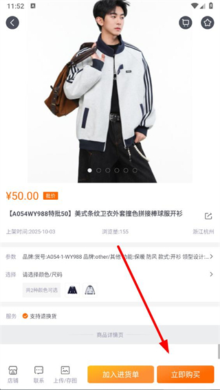 2、在商品詳情頁面,查看商品信息,選擇好顏色尺碼后,點擊立即購買選項。