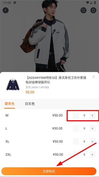 3、若點擊立即購買,在彈出的頁面中,選擇商品顏色尺碼,并通過加號按鈕選擇購買數(shù)量,再次點擊立即購買。