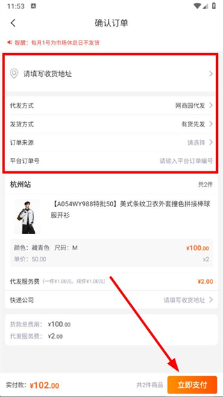 4、進入確認訂單頁面,填寫收貨地址,選擇代發(fā)方式、發(fā)貨方式等信息,確認訂單信息無誤后,點擊立即支付完成下單。