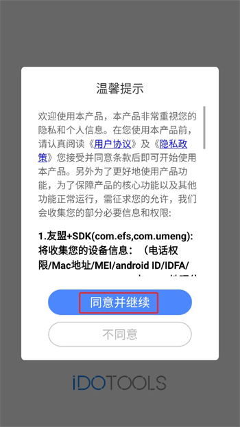 1、進(jìn)入軟件之中,首先會(huì)有一個(gè)溫馨提示的窗口界面,點(diǎn)擊【同意并繼續(xù)】同意這個(gè)軟件對(duì)于使用過(guò)程中的一些權(quán)限;