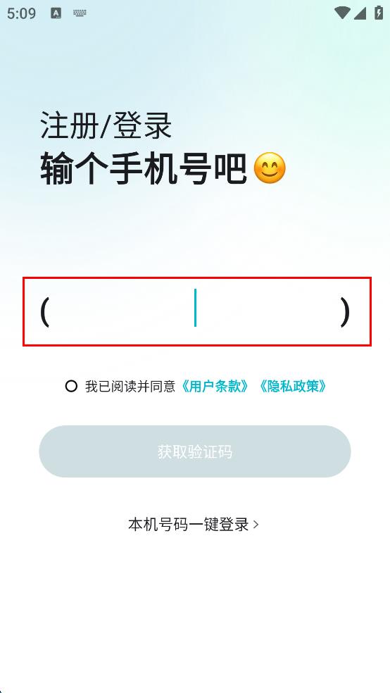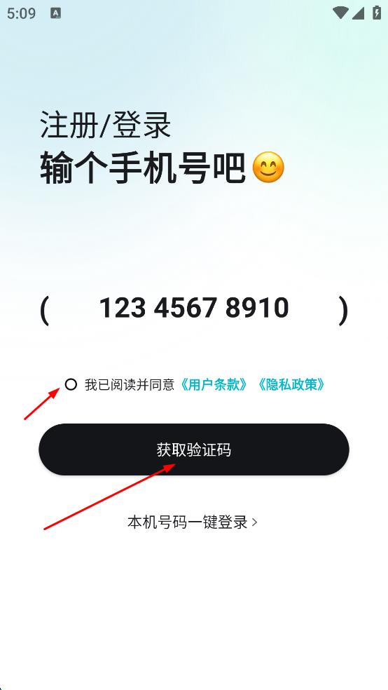 3、在注冊/登錄頁面,輸入手機(jī)號碼,勾選“我已閱讀并同意用戶條款和隱私政策,然后點(diǎn)擊“獲取驗(yàn)證碼”。