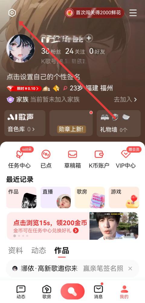 1、進(jìn)入全民K歌我的頁(yè)面,點(diǎn)擊左上角的設(shè)置圖標(biāo),進(jìn)入設(shè)置界面,這是操作的起始步驟。