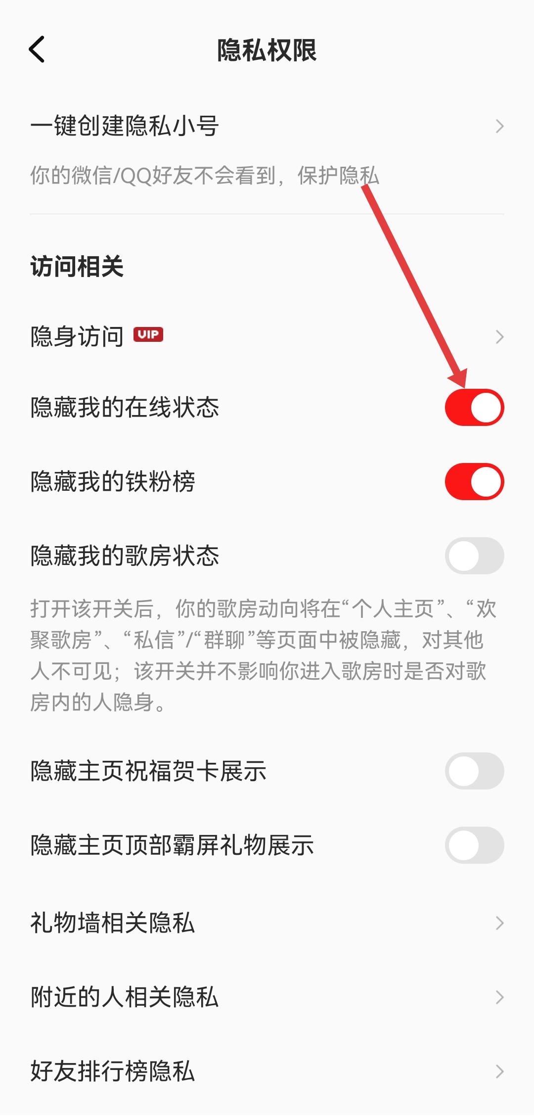 3、在隱私權(quán)限頁(yè)面里,找到隱藏我的在線狀態(tài)選項(xiàng),點(diǎn)擊右側(cè)的開(kāi)關(guān)按鈕將其開(kāi)啟,即可成功隱藏在線狀態(tài)。