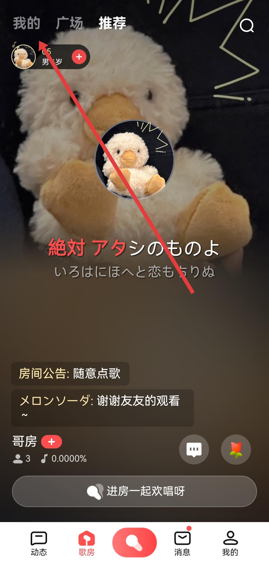 1、打開全民K歌,點(diǎn)擊底部導(dǎo)航欄的歌房的選項(xiàng),進(jìn)入歌房的頁(yè)面后,需要點(diǎn)擊左上角我的按鈕。