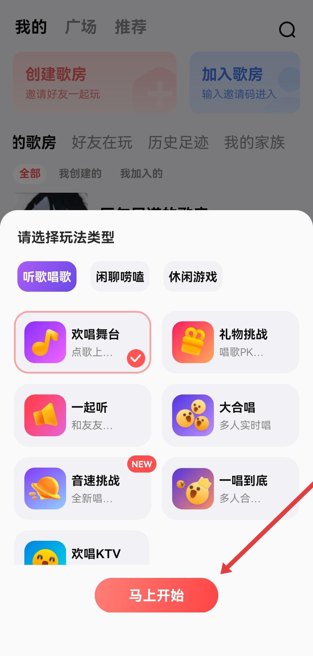3、在請(qǐng)選擇玩法類型彈窗里,選擇歌房玩法如歡唱舞臺(tái)、禮物挑戰(zhàn)等,點(diǎn)擊馬上開始成功開啟歌房。