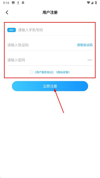 3、輸入手機(jī)號(hào)碼,填入驗(yàn)證碼,設(shè)置密碼,勾選服務(wù)協(xié)議,點(diǎn)擊立即注冊(cè)。