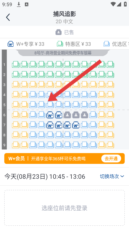 2、在影片的詳情頁,需要選擇具體觀影場次,點擊場次右側(cè)的購票按鈕,進入座位選擇界面。