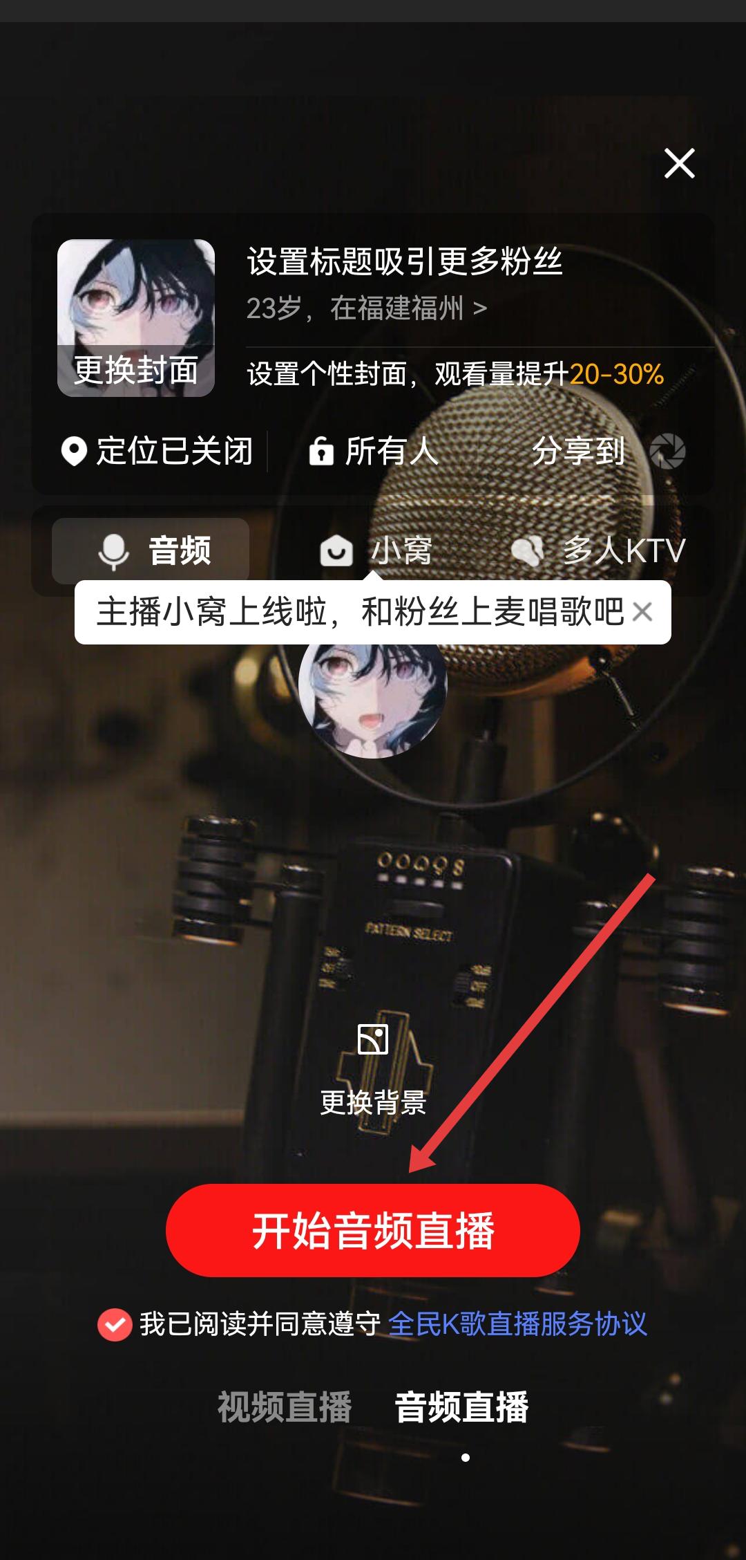 2、在直播設置界面,設置標題、封面等信息,勾選協(xié)議后點擊開始音頻直播,也可以選擇視頻直播。
