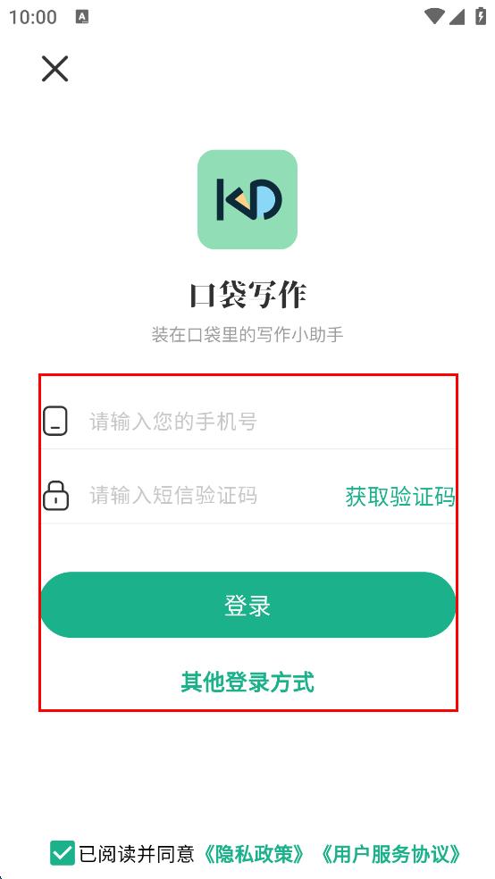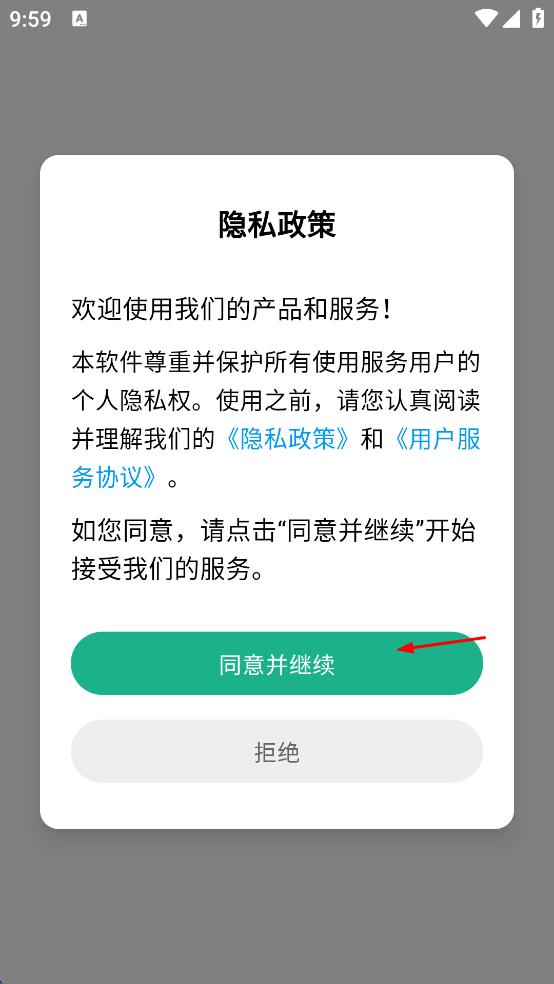 1、打開口袋寫作App,出現(xiàn)隱私政策彈窗,閱讀后點(diǎn)擊同意并繼續(xù)按鈕。