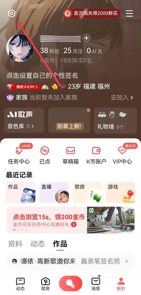 1、進(jìn)入全民K歌我的頁面,需要點(diǎn)擊左上角的設(shè)置圖標(biāo),進(jìn)入賬號設(shè)置的界面。