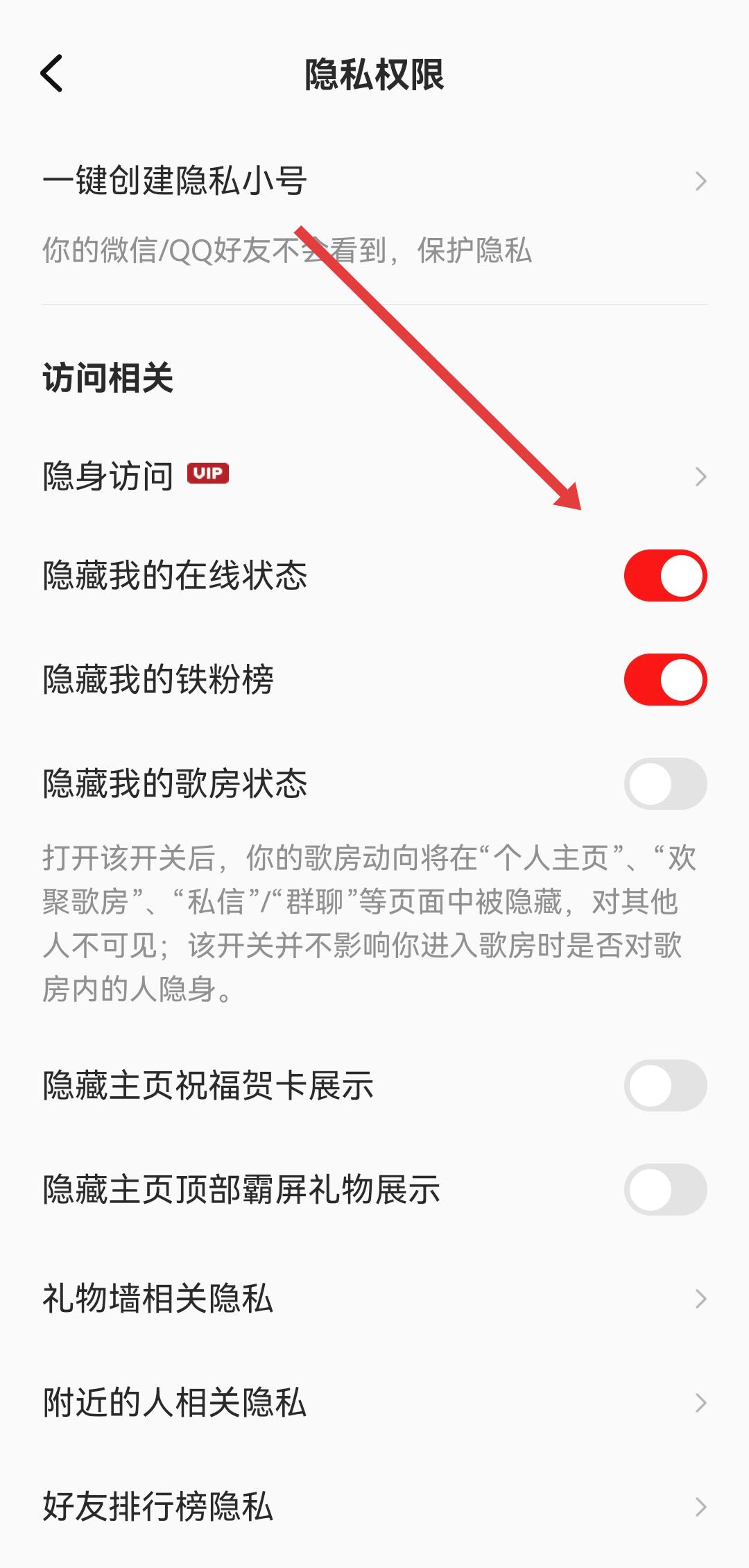 3、在隱私權(quán)限頁面里,可以按照需要開啟/關(guān)閉隱藏我的在線狀態(tài)等開關(guān),完成隱私權(quán)限的設(shè)置。