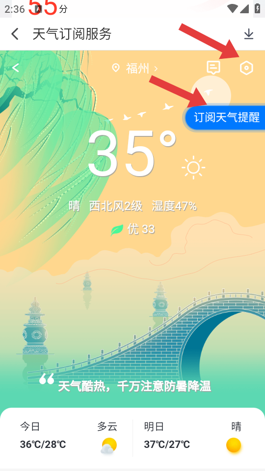 2、在天氣訂閱服務(wù)頁面,先點擊訂閱天氣提醒按鈕,最后點擊設(shè)置圖標(biāo)進入詳細(xì)設(shè)置。