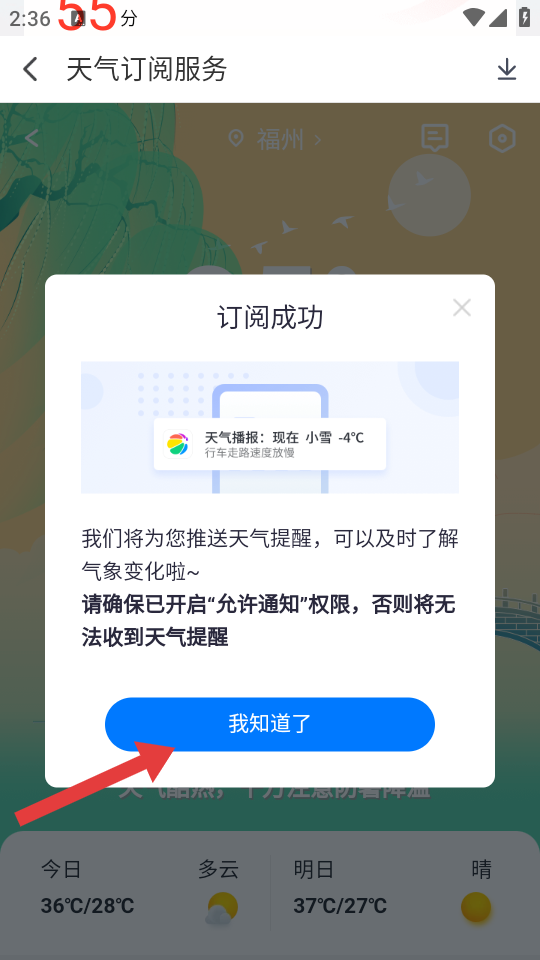 3、訂閱后彈出訂閱成功提示彈窗,點擊我知道了按鈕,確認(rèn)訂閱完成。
