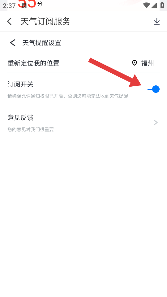 4、最后進入設(shè)置頁面,確保訂閱開關(guān)處于開啟狀態(tài),即可成功訂閱并接收天氣預(yù)報提醒。