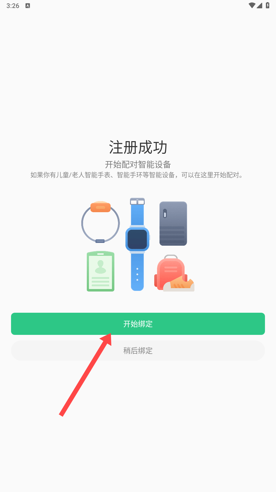 2、注冊(cè)成功進(jìn)入頁(yè)面后,此時(shí)能看到開(kāi)始綁定與稍后綁定兩個(gè)選項(xiàng),若準(zhǔn)備好綁定設(shè)備,點(diǎn)擊開(kāi)始綁定,正式開(kāi)啟綁定之旅。