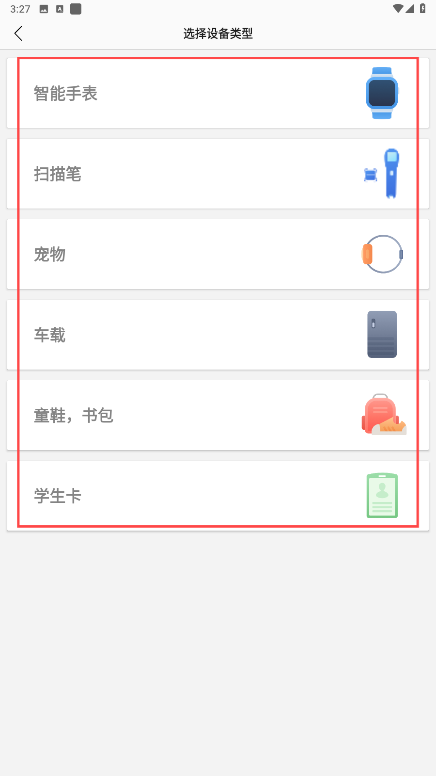 3、在選擇設(shè)備類型界面,選擇需要綁定的設(shè)備,這里羅列了智能手表、掃描筆、寵物、車載等多種設(shè)備類別,點(diǎn)擊綁定。