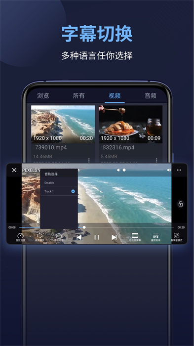 萬能電影播放器是一個手機全能視頻播放器,支持所有視頻、音頻格式!播放器有4種播放畫面,分別是android系統(tǒng)默認全屏畫面、覆蓋手機全屏畫面、擴大畫面、視頻原始畫面。