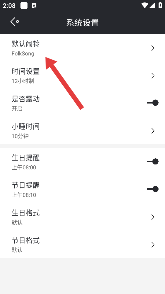 3、在系統(tǒng)設(shè)置界面,點擊默認鬧鈴選項,進入鈴聲選擇的頁面。