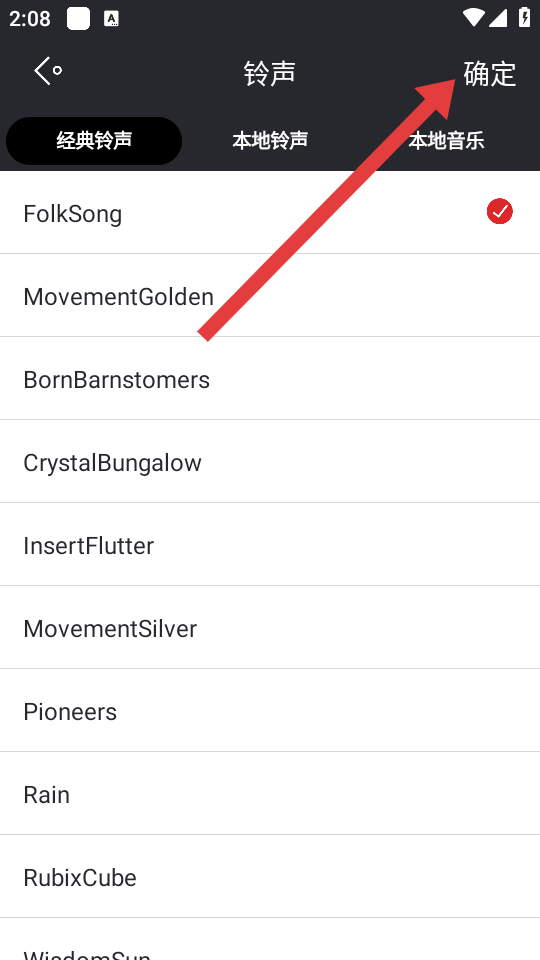 4、在鈴聲選擇頁面,選擇要設(shè)置的鈴聲,點擊右上角確定按鈕,完成鈴聲設(shè)置。