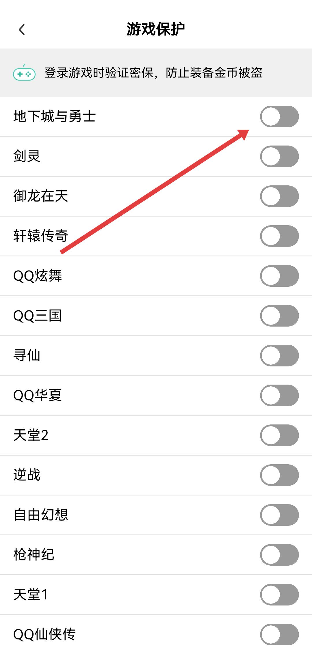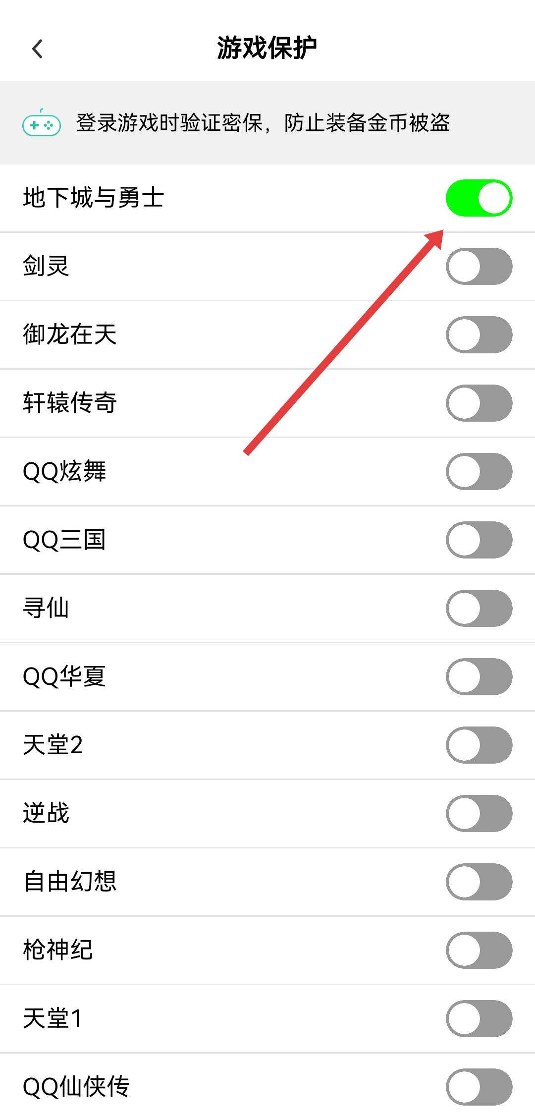2、在游戲保護(hù)頁面中,找到需要保護(hù)的游戲如地下城與勇士,定位其右側(cè)的開關(guān)按鈕。