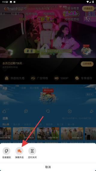 3、在底部彈出的控制欄中,點擊彈幕開啟的圖標,即可開啟彈幕。