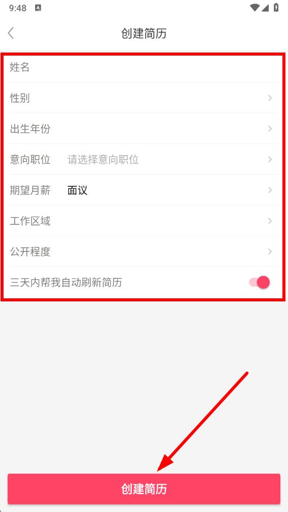 4、在創(chuàng)建簡(jiǎn)歷頁(yè)面,依次填寫(xiě)姓名、性別、出生年份等相關(guān)信息,確認(rèn)信息無(wú)誤后,點(diǎn)擊創(chuàng)建簡(jiǎn)歷按鈕,即可完成簡(jiǎn)歷信息的創(chuàng)建。