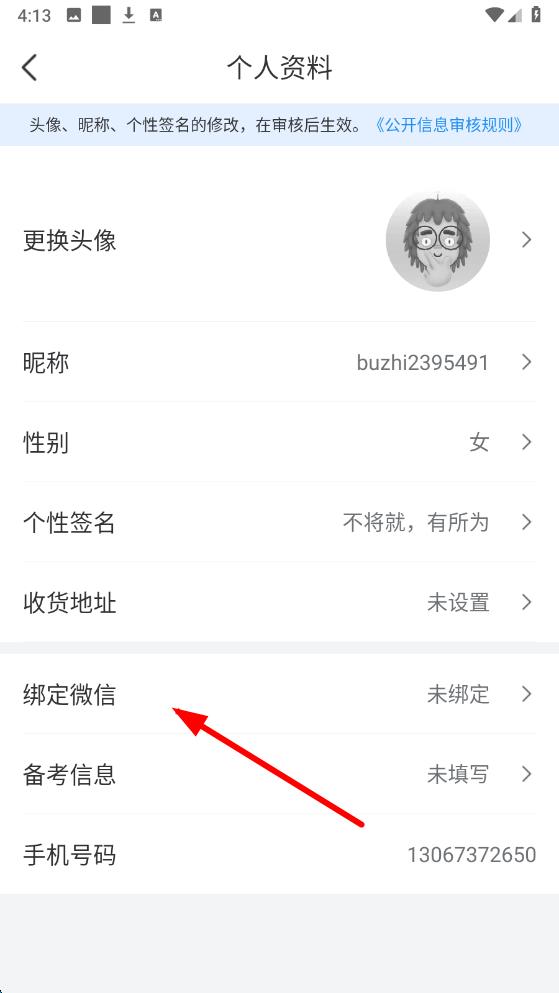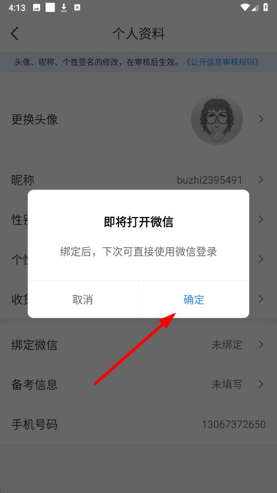 3、在個人資料頁面里找到綁定微信選項并點擊,在彈出的提示框中點擊確定后按照后續(xù)提示完成微信綁定操作。