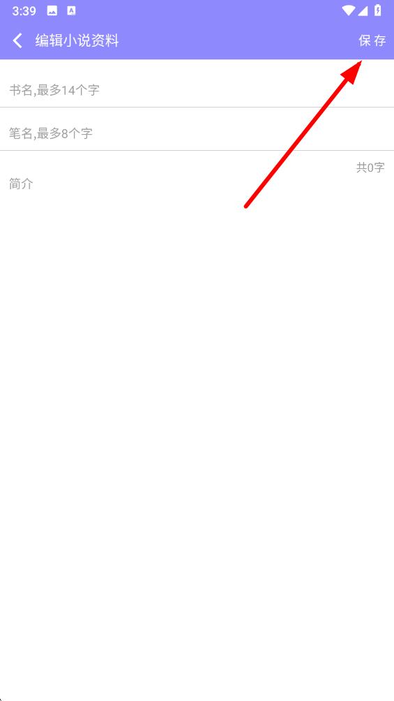 2、在編輯小說(shuō)資料頁(yè)面,輸入書名、筆名、簡(jiǎn)介等信息后,點(diǎn)擊右上角保存。