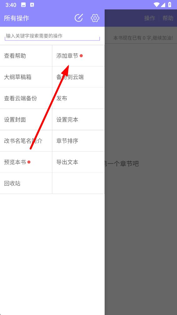 4、在小說(shuō)的操作頁(yè)面,找到并點(diǎn)擊添加章節(jié)選項(xiàng)。