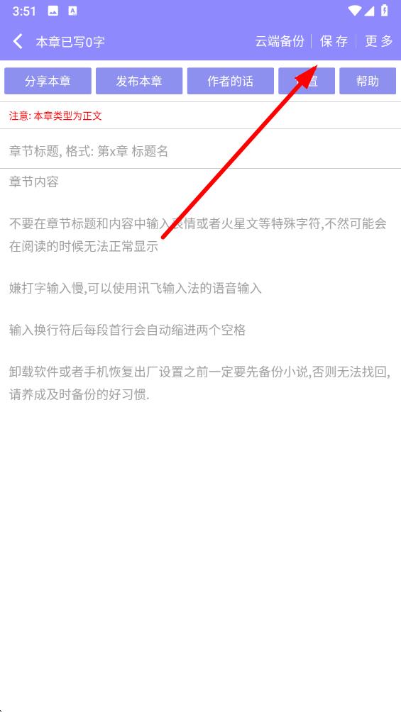 6、在新的頁(yè)面輸入章節(jié)標(biāo)題和內(nèi)容進(jìn)行創(chuàng)作后點(diǎn)擊右上角保存即可。