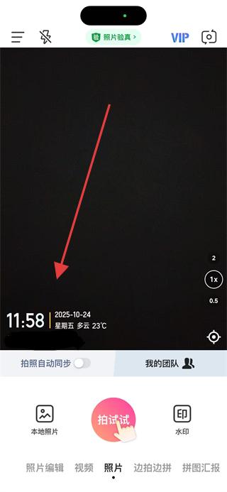 1、打開今日水印相機應(yīng)用,在底部導(dǎo)航欄點擊“照片”選項進入拍攝界面。