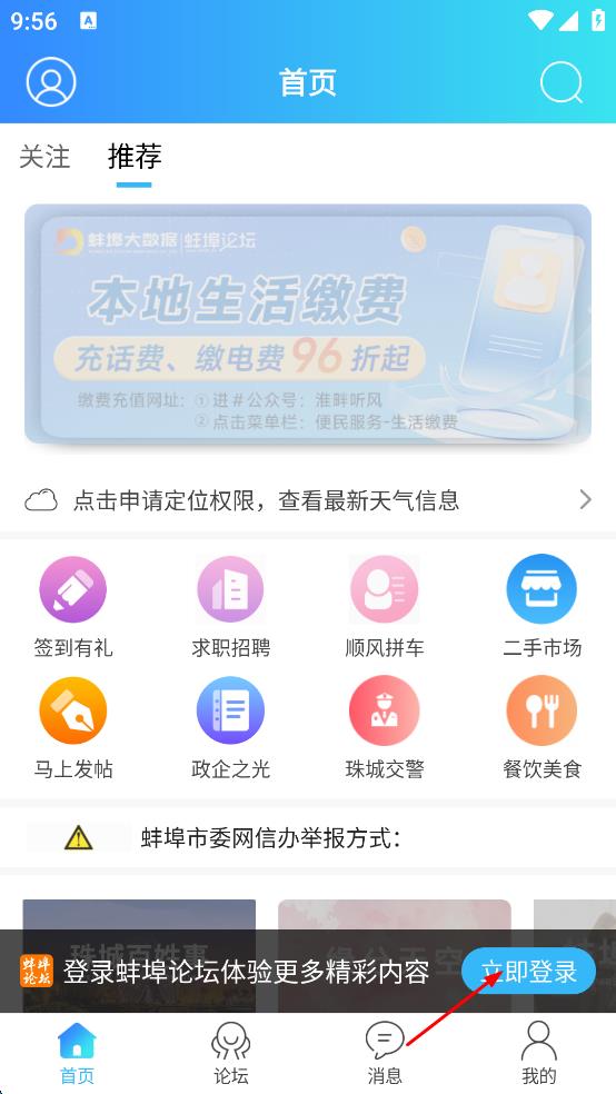 2、進入APP首頁后,點擊頁面下方的“立即登錄”按鈕。