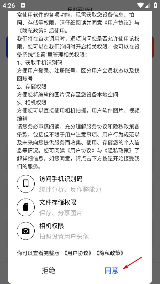 1、打開刷圈圖軟件,會彈出權(quán)限獲取提示框,仔細閱讀用戶協(xié)議與隱私政策后,點擊“同意”按鈕,允許軟件獲取手機識別碼、存儲、相機等權(quán)限。