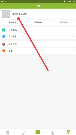 1、進(jìn)入應(yīng)用發(fā)現(xiàn)頁面,可以點(diǎn)擊頂部請點(diǎn)擊登錄/注冊區(qū)域,進(jìn)入賬號登錄或注冊界面。