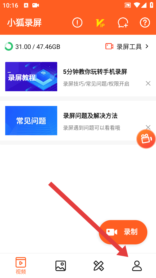 1、在小狐錄屏主界面,點擊底部導(dǎo)航欄我的選項,進入個人頁面。