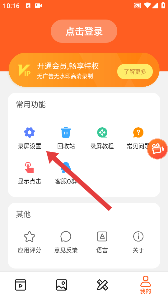 2、在個人頁面的常用功能區(qū)域,點擊錄屏設(shè)置選項,進入錄屏設(shè)置頁面。