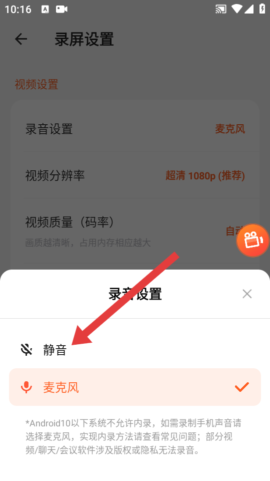 4、在錄音設(shè)置選擇框中,點擊靜音的選項,完成靜音模式設(shè)置。