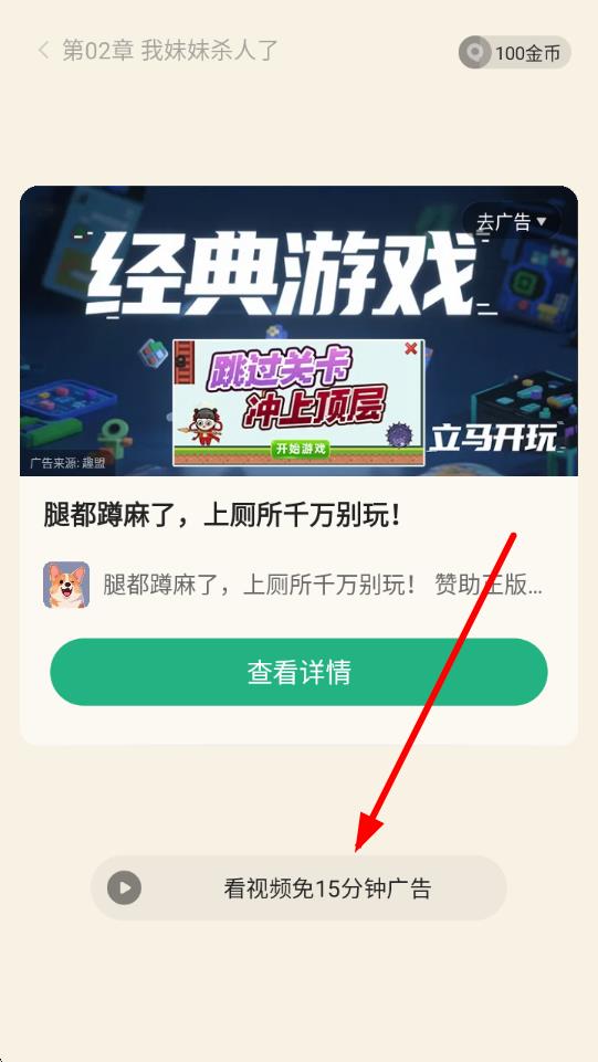 2、在小說閱讀過程中,若遇到廣告,查看廣告區(qū)域下方,找到看視頻免15分鐘廣告按鈕,點(diǎn)擊該按鈕。