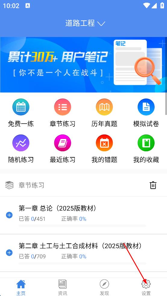 1、打開道路工程學(xué)習(xí)軟件,進(jìn)入主頁后,點擊頁面右下角的設(shè)置選項,進(jìn)入設(shè)置頁面。