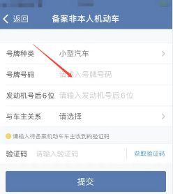 6、輸入要備案的非本人機動車車牌號碼和發(fā)動機號后六位,然后選擇跟車主的關(guān)系,獲取驗證碼,提交等待審核即可!